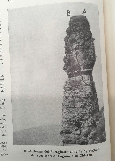 Le prime scalate del Gendarme sono state compiute dai rocciatori delle ancora sezioni UTOE di Lugano e Chiasso. Per quanto riguarda i Chiassesi la loro arrampicata, stando a Sci e Piccozza del settembre 1938, è dell’estate di quell’anno. La via B, dal lato NO, è stata aperta da G. Chiesa, C. Ferrari e P. Chiesa : « Dall’attacco abbastanza facile si sale per circa 8 metri tra erbe e roccia e si arriva su un piccolo terrazzo, sotto uno strapiombo abbastanza pronunciato (…) Di qui ci si sposta sullo spigolo sinistro, molto esposto, e si sale per circa 5 metri, sempre strapiombanti, impiegando 6 chiodi. Si giunge su un tratto di roccia friabilissima, ricoperta da malsicuri ciuffi d’erba (molto difficile) indi si prosegue per altri 4 metri sino ad una piccola grotta (…) Dalla grotta ci si sposta per circa 2 metri a destra, quindi si sale per altri 5 metri su roccia abbastanza sicura ma molto esposta (…) Si continua per traversata a sinistra (…) quindi salendo per altri 10 metri su roccia verticale e friabile si giunge alla sommità ». Tempo di percorrenza 2h30 e impiego di 13 chiodi.